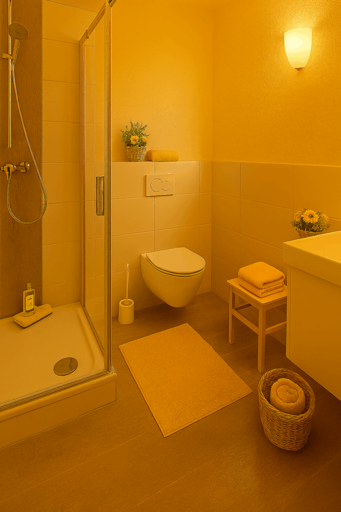 Im Bad können sie stufenlos die begehbare Dusche erreichen. Ein Handtuchpaket, Fön, und Seife stehen ebenfalls für Ihren Aufenthalt zur Verfügung.